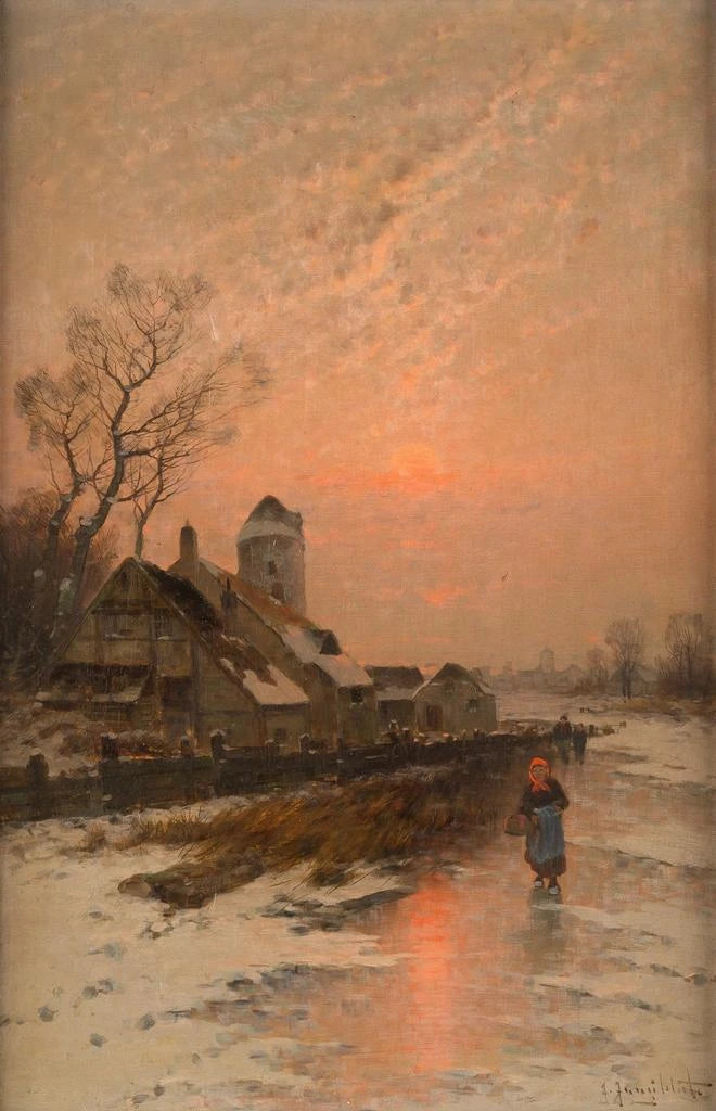 Johann Jungblut, actif au XIXe siècle, est reconnu pour ses paysages qui capturent la beauté de la nature à travers des palettes de couleurs délicates. Influencé par le romantisme, il s'inscrit dans une tradition artistique qui valorise l'émotion et l'expression personnelle. Ses œuvres, souvent inspirées par des scènes de la vie quotidienne et des paysages naturels, témoignent d'une sensibilité aiguë aux variations de lumière et de couleur. Jungblut a su se démarquer par sa capacité à rendre l'atmosphère d'un moment fugace, comme en témoigne "Soleil d'hiver sur lac gelé", qui évoque la magie d'un instant hivernal.