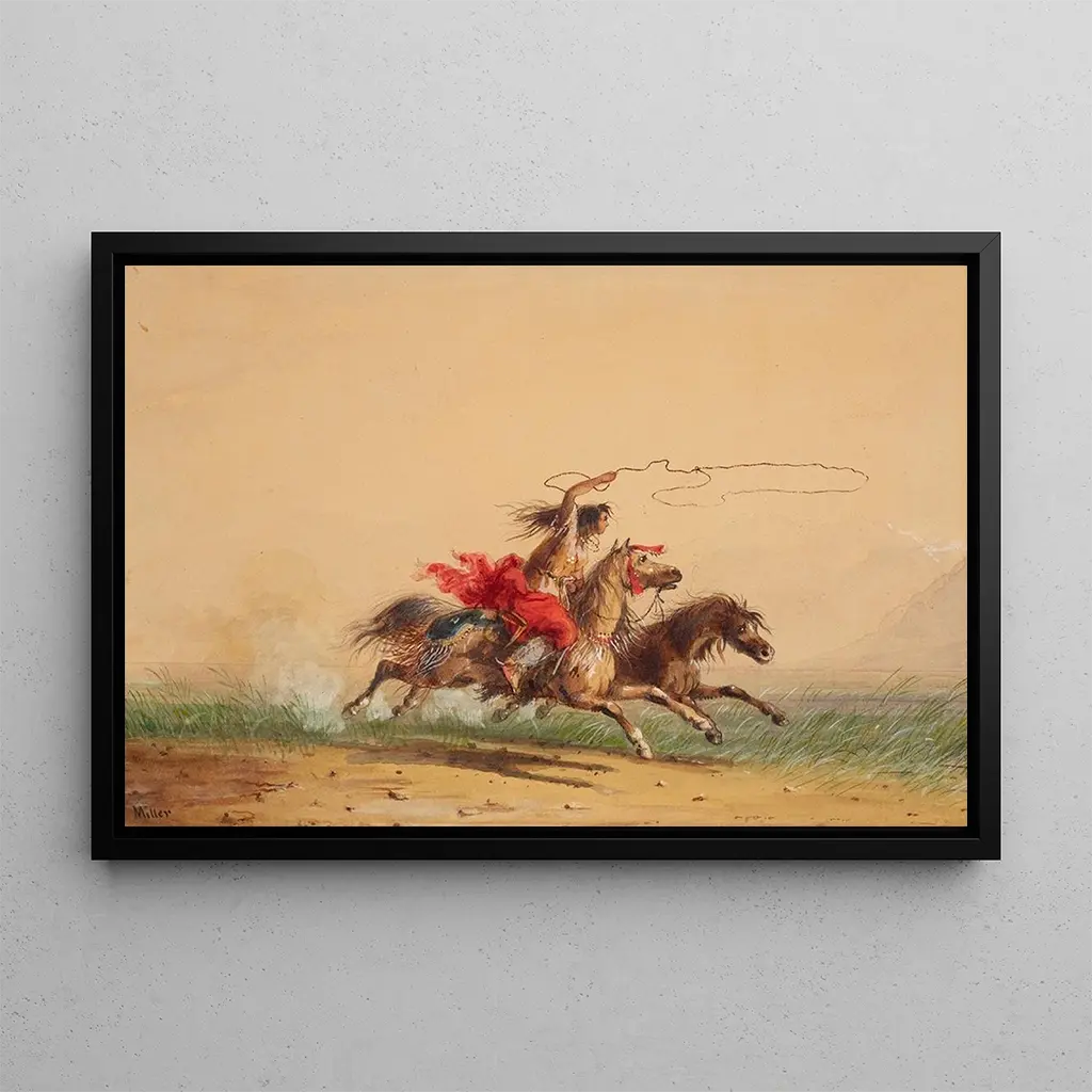 Attraper des chevaux sauvages au lasso : une danse entre l'homme et la nature Dans cette œuvre captivante, Alfred Jacob Miller capture l'essence sauvage de l'Ouest américain à travers une scène dynamique où des cavaliers s'efforcent d'attraper des chevaux indomptés. Les couleurs terreuses et vibrantes évoquent la chaleur du soleil couchant, tandis que les détails minutieux des chevaux et des cavaliers témoignent d'une maîtrise technique remarquable. L'atmosphère est à la fois énergique et poétique, invitant le spectateur à ressentir l'adrénaline de cette poursuite audacieuse. Chaque coup de pinceau semble raconter une histoire, plongeant le regard dans un monde où la nature et l'homme s'affrontent avec passion. Alfred Jacob Miller : un témoin de l'Ouest américain Né en 1810, Alfred Jacob Miller est un peintre américain dont le travail est profondément ancré dans l'exploration et la représentation de l'Ouest sauvage. Influencé par ses voyages avec des explorateurs, il a su capturer la beauté et la brutalité de cette époque. Miller a été l'un des premiers artistes à documenter la vie des trappeurs, des Indiens et des cow-boys, créant ainsi un héritage visuel précieux. Son style, un mélange de réalisme et de romantisme, permet de ressentir l'authenticité de ses sujets tout en les idéalisant. À travers ses œuvres, il nous offre un aperçu fascinant de la conquête de l'Ouest. Une acquisition décorative aux multiples atouts La reproduction d'Attraper des chevaux sauvages au lasso est une pièce décorative qui saura enrichir n'importe quel espace, que ce soit un salon, un bureau ou une chambre. Sa qualité d'impression et sa fidélité aux détails originaux font de cette toile un choix idéal pour les amateurs d'art et les passionnés d'histoire. L'attrait esthétique de cette œuvre réside dans sa capacité à évoquer des émotions fortes, tout en ajoutant une touche d'élégance rustique à votre intérieur. En intégrant cette reproduction dans votre décoration, vous invitez une part de l'histoire américaine et de la beauté naturelle dans votre quotidien.