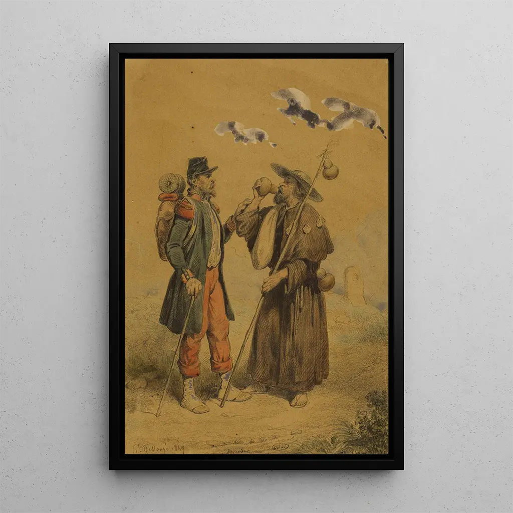 Dans l'œuvre "Soldat donnant à boire à un pèlerin" d'Hippolyte Bellangé, un moment de tendresse et d'humanité se déploie sous nos yeux. La scène, riche en détails, met en avant un soldat en uniforme, offrant de l'eau à un pèlerin fatigué. Les couleurs chaudes et terreuses évoquent une atmosphère de chaleur et de solidarité, tandis que la technique de Bellangé, mêlant réalisme et romantisme, donne vie à cette interaction émotive. Chaque élément de la composition, des expressions aux postures, contribue à créer une narration visuelle puissante qui touche le cœur.