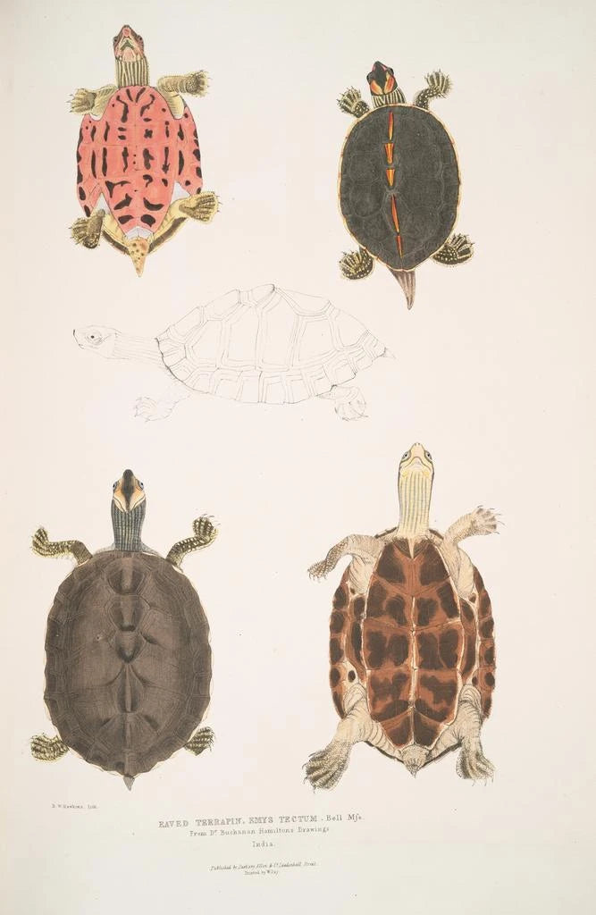 John Edward Gray, reconnu pour ses contributions à la zoologie au XIXe siècle, a consacré une grande partie de sa carrière à l’étude des reptiles et des amphibiens. Ses travaux ont été marqués par une approche scientifique rigoureuse, couplée à un sens artistique développé. Gray a su allier l’observation minutieuse de la nature à une représentation esthétique, faisant de ses illustrations des références dans le domaine. La tortue à toit, emblématique de la biodiversité aquatique, est un exemple parfait de son talent à capturer la vie sauvage avec précision et beauté.